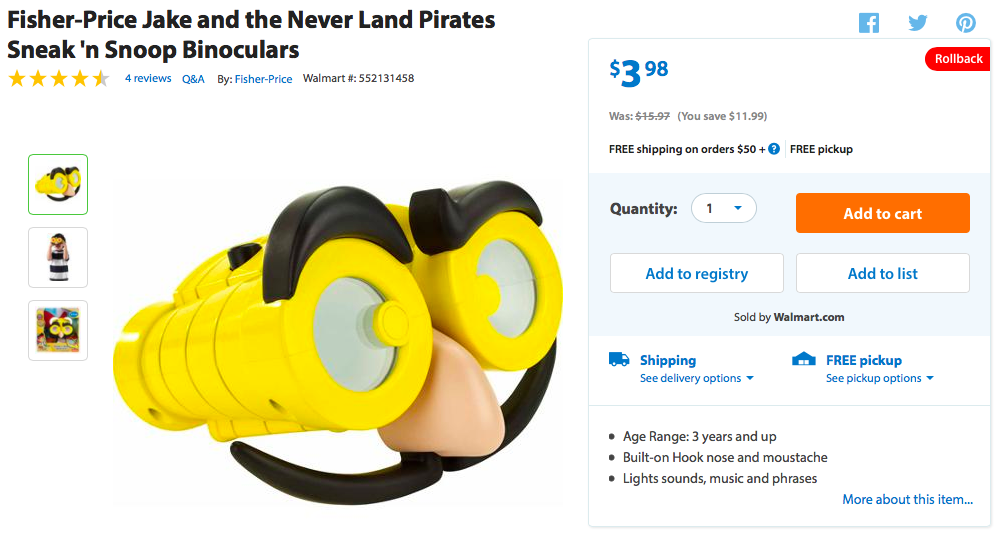 Fisher-Price Jake and the Never Land Pirates Sneak ‘n Snoop Binoculars, $3.98 (Orig $15.97)